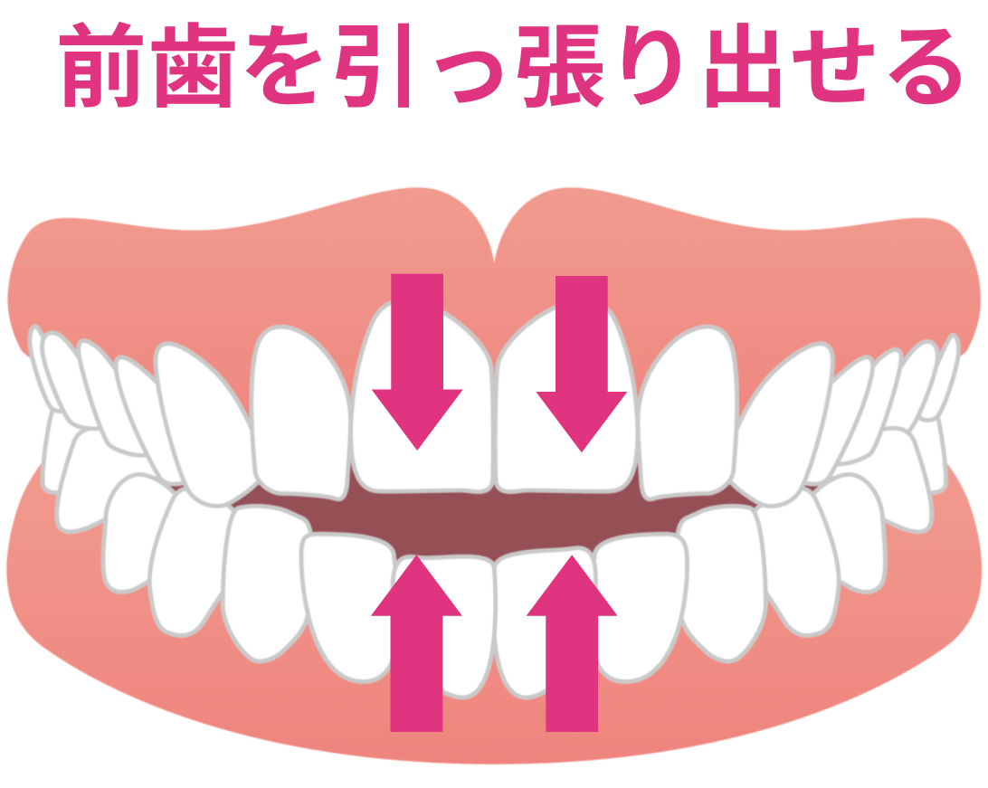 上の前歯を引っ張り出しすぎると、歯ぐきも一緒に伸びてしまい、ひどい場合は笑った時に歯ぐきが過剰に見える「ガミースマイル」になってしまうこともあるのです。
