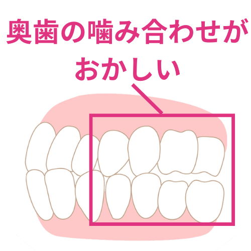 これが原因の開咬の場合、ものを噛んだ際の力が集中するため奥歯の負担が大きく、噛み合わせがおかしくなっていることが少なくありません。